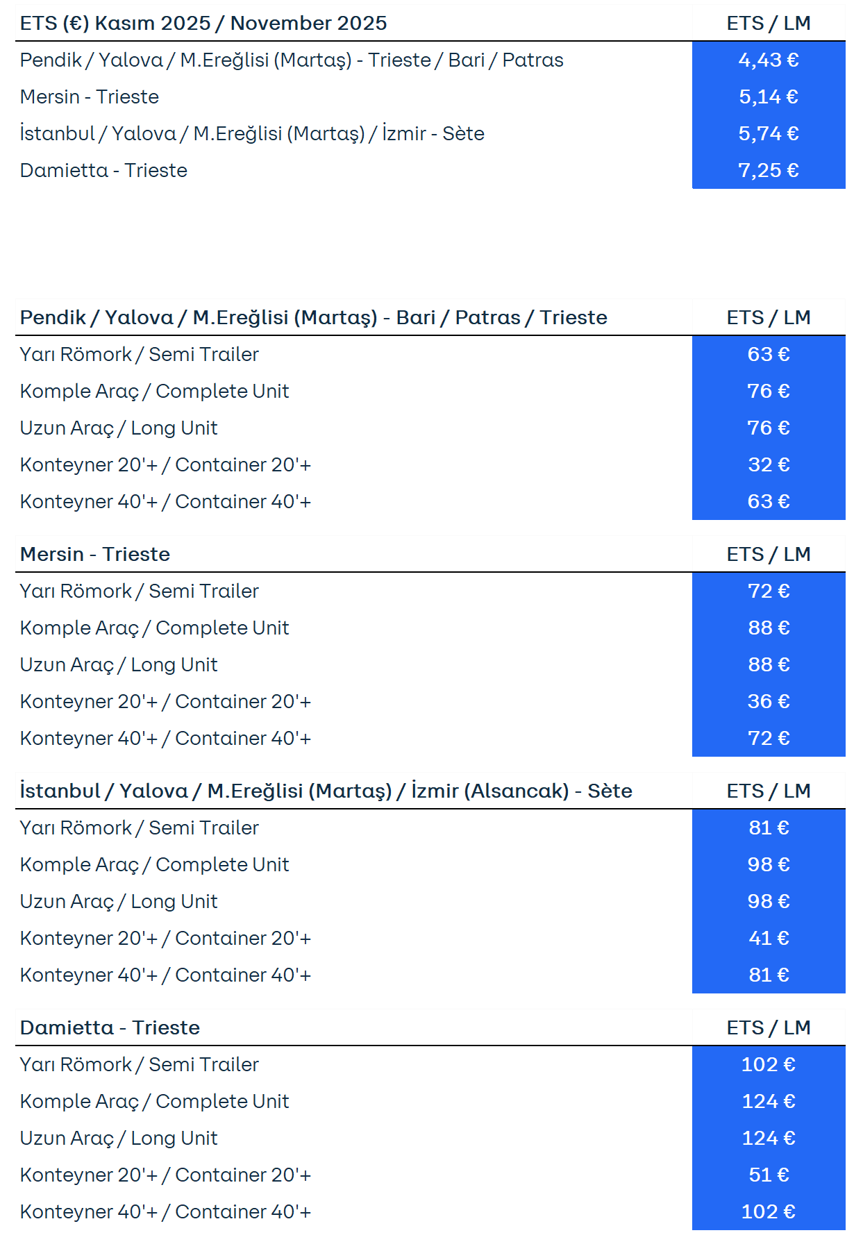 Avrupa Birliği kuralları gereğince hatlarımızda taşımakta olduğumuz araçlara uygulanacak olan birleştirilmiş ETS (“Emission Trading System”- Emisyon Ticaret Sistemi) ve AB Denizcilik Yakıtı (FEUM) ücretleri, web sitemizde yayınlanan 2025 ETS skalası uyarınca ve ilgili dönemde karbon piyasalarında yaşanan değişimler dikkate alınarak 1 Kasım 2025 tarihi itibarıyla standart araçlar ve konteynerler için aşağıdaki şekilde belirlenmiştir. İlgili skala doğrultusunda her ayın 21. günü bir sonraki ayın 1. günü itibariyle 30 gün süreyle uygulanacak olan ETS ücretlendirme bilgisi tarafınıza e-posta marifetiyle duyurulacaktır. ETS’nin uygulanmasına ilişkin olarak karbon istihkak fiyatlarındaki değişiklikleri bu web sayfasından takip edebilirsiniz.