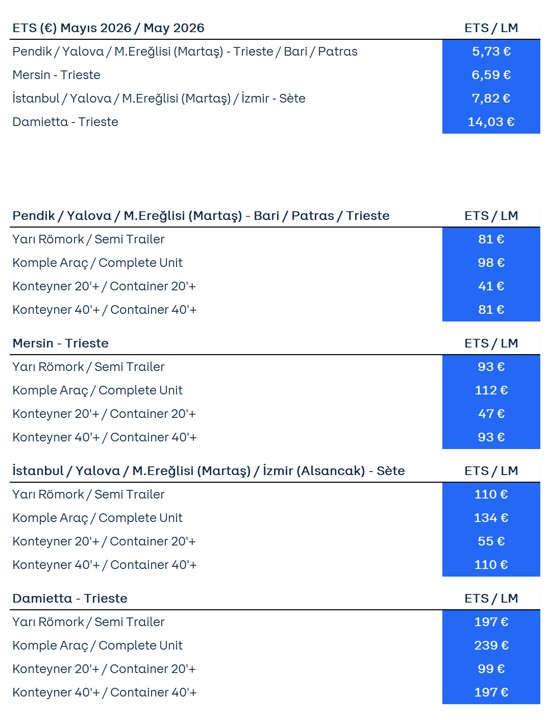 Avrupa Birliği kuralları gereğince hatlarımızda taşımakta olduğumuz araçlara uygulanacak olan birleştirilmiş ETS (“Emission Trading System”- Emisyon Ticaret Sistemi) ve AB Denizcilik Yakıtı (FEUM) ücretleri, web sitemizde yayınlanan güncellenmiş 2026 ETS & FEUM skalası uyarınca ve ilgili dönemde karbon piyasalarında yaşanan değişimler dikkate alınarak 1 Mayıs 2026 tarihi itibarıyla standart araçlar ve konteynerler için aşağıdaki şekilde belirlenmiştir. İlgili skala doğrultusunda her ayın 21. günü bir sonraki ayın 1. günü itibariyle 30 gün süreyle uygulanacak olan ETS ücretlendirme bilgisi tarafınıza e-posta marifetiyle duyurulacaktır. ETS’nin uygulanmasına ilişkin olarak karbon istihkak fiyatlarındaki değişiklikleri bu web sayfasından takip edebilirsiniz.