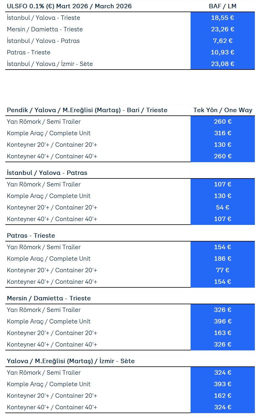 As of 1 March 2026, BAF rates applied to the freight rates of units transported on our lines have been determined according to the changes in foreign exchange rates, fuel prices and the BAF Scale available on our website. Please see below shown tables for BAF rates of standard units and containers for March 2026.