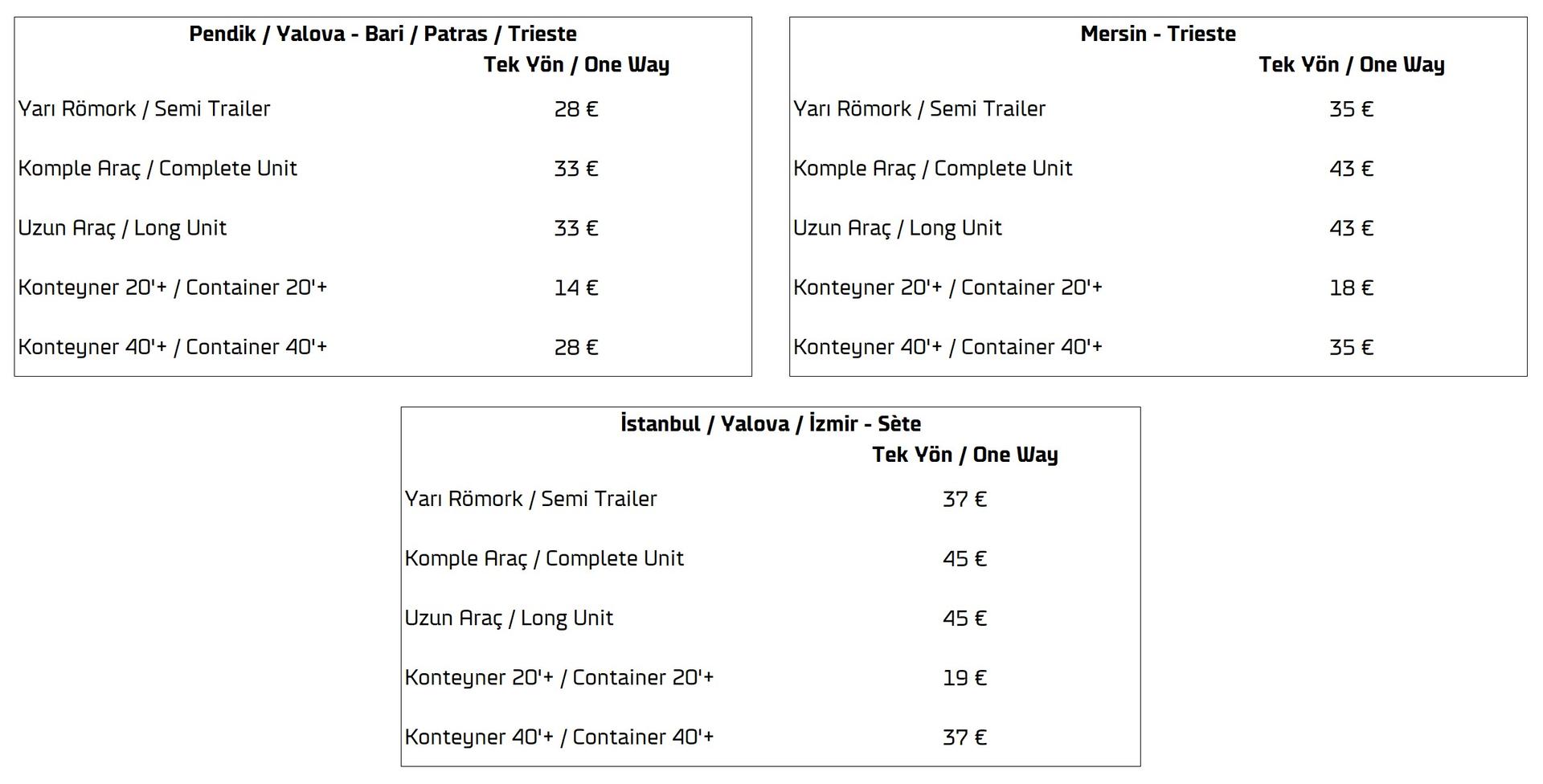 Taking into account the changes in the carbon markets in the corresponding period and the ETS scale published on our website, the ETS (Emission Trading System) fees to be applied to the vehicles we carry on our lines in accordance with the European Union rules have been determined as follows for standard vehicles and containers. The rates will be valid as of 1 May 2024. In line with this scale, the applicable ETS rates will be announced to you via e-mail on the 21st day of each month applicable as of the 1st day of the following month for a period of 30 days. Changes in the carbon allowance fees related to the ETS can be followed from this web-link.